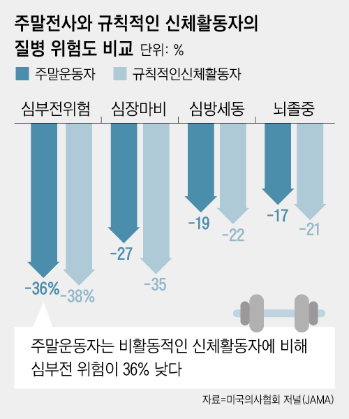 2022년, 미국 하버드대 공중보건대학(Harvard T.H. Chan School of Public Health)에서 발표한 연구에 따르면, **운동을 ‘주말에 몰아서’ 하는 사람들(소위 ‘주말 전사’라 불리는 이들)**과 운동을 매일 조금씩 나누어 하는 사람들의 사망률은 유의미한 차이가 없었다. 이 연구는 약 35만 명의 데이터를 분석해, 주간 운동량만 확보된다면 운동 빈도와는 무관하게 심혈관계 질환이나 암에 의한 사망률이 감소한다는 결과를 도출했다.