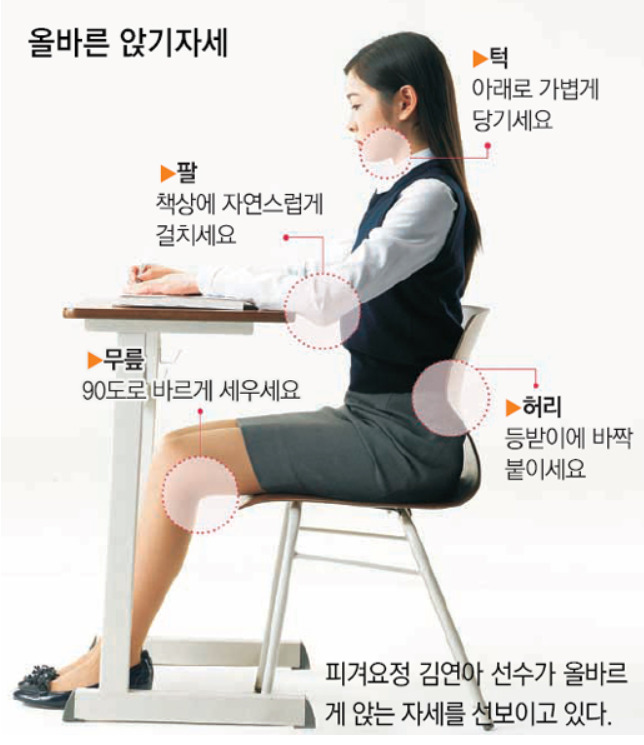 허리를 곧게 세우고, 무릎이 엉덩이보다 약간 높거나 같은 높이에 위치하도록 유지하며, 등받이를 적절히 활용하는 것이 중요하다.