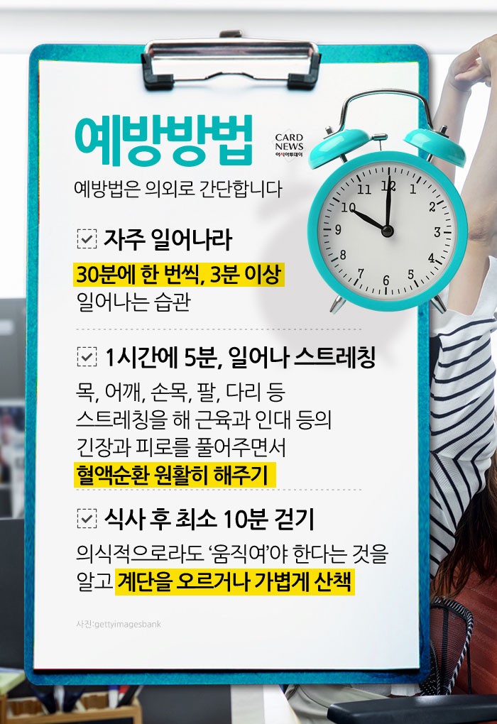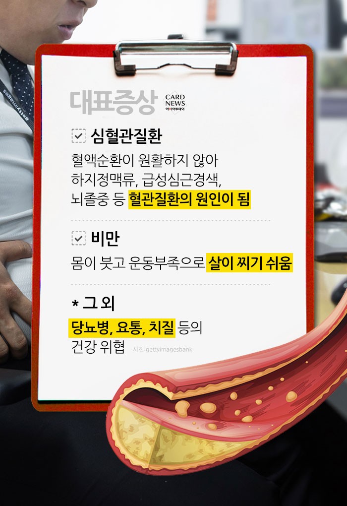 2. 심혈관 질환: 오래 앉아 있으면 혈액 순환이 저하되어 고혈압, 심근경색, 심부정맥혈전증(DVT) 등의 위험이 높아진다.