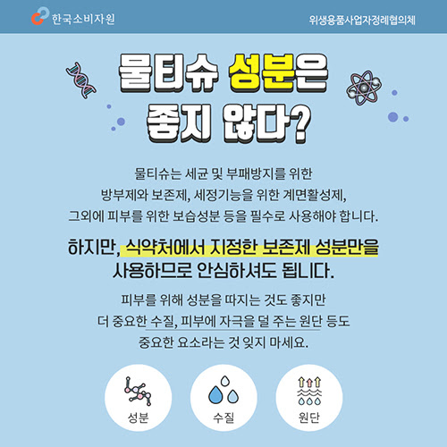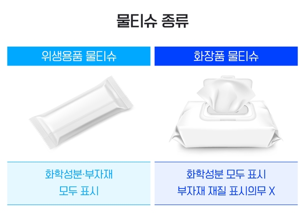 화장품으로 분류되는 물티슈는 '인체에 직접 사용하는 것을 목적으로 제조된 제품'이다. 즉, 피부를 닦거나 메이크업을 제거하거나, 혹은 아기 피부를 닦는 등의 용도로 만들어진 제품들이다. 이런 물티슈는 「화장품법」에 따라 제조되며, 사용되는 모든 성분이 공개되어야 하고, 식품의약품안전처(식약처)의 기준에 따라 안전성 검토를 거친다.
