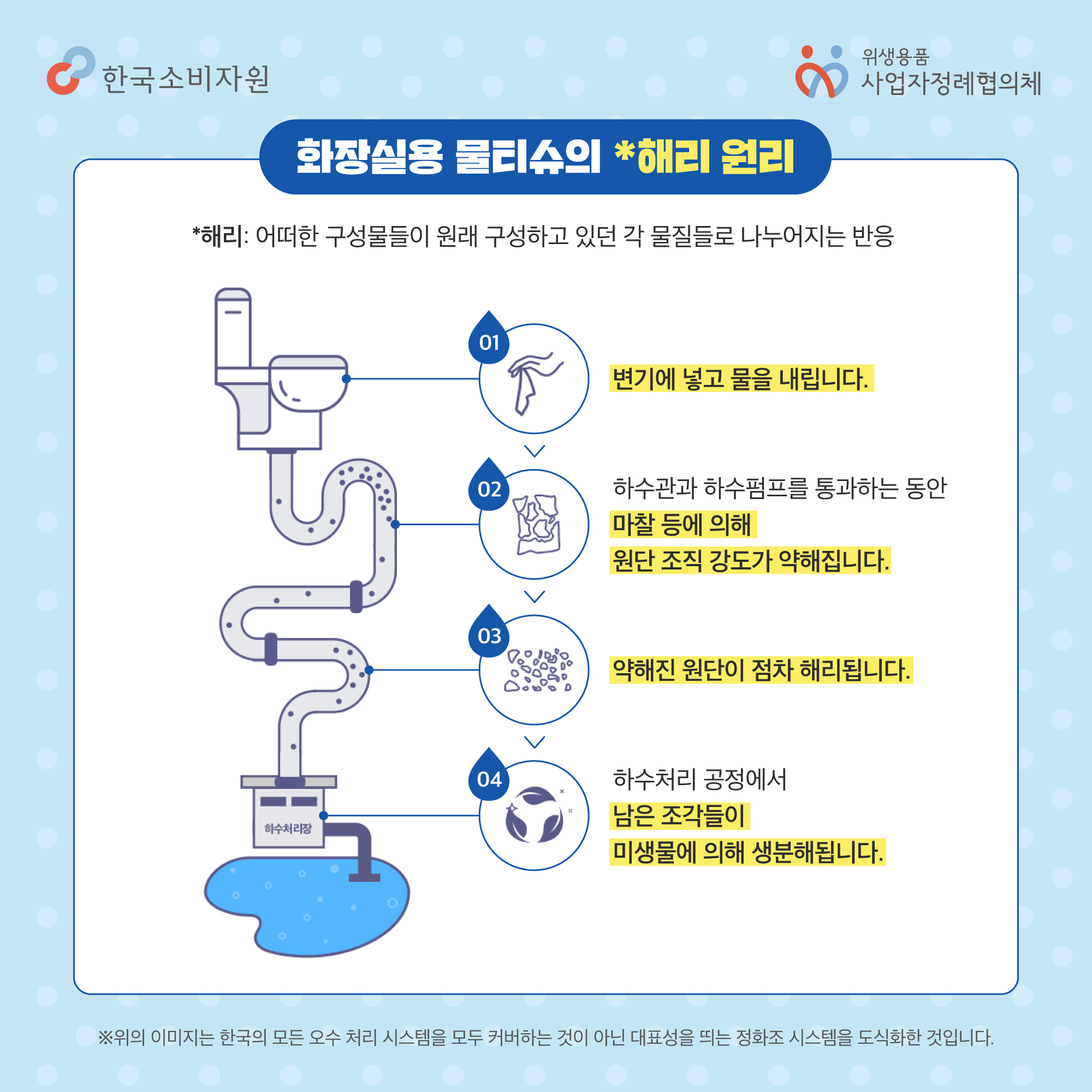 물티슈 제품 중 일부는 ‘변기에 버려도 된다’고 표시되어 있는 경우가 있다. 그러나 실제로는 대부분의 물티슈가 변기와 하수도에 문제를 일으킬 수 있다. 이는 물티슈의 원단이 종이가 아닌 **부직포(폴리에스터 등 합성섬유)**로 이루어져 있어 쉽게 분해되지 않기 때문이다.