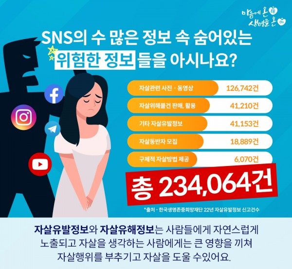 이와 같은 정보는 청소년이나 정신적 취약계층에게 특히 위험하게 작용한다. 실제로 온라인 커뮤니티나 SNS, 동영상 플랫폼 등에서는 ‘자살 명소 후기’, ‘자살 성공률 높은 방법’ 등의 키워드로 쉽게 접근 가능한 게시글이 여전히 다수 존재한다.