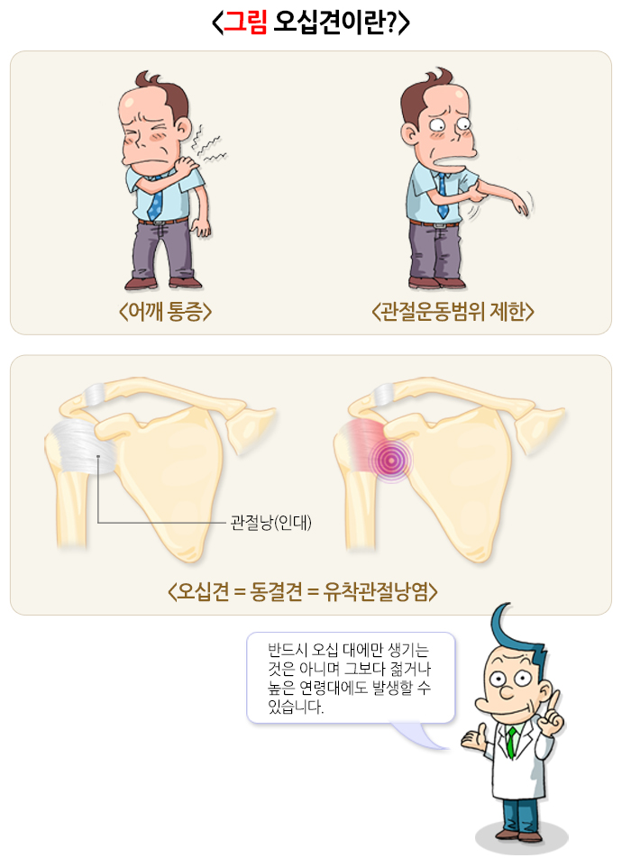 오십견(유착성 관절낭염): 어깨 관절의 움직임이 제한되고 극심한 통증이 동반됩니다.