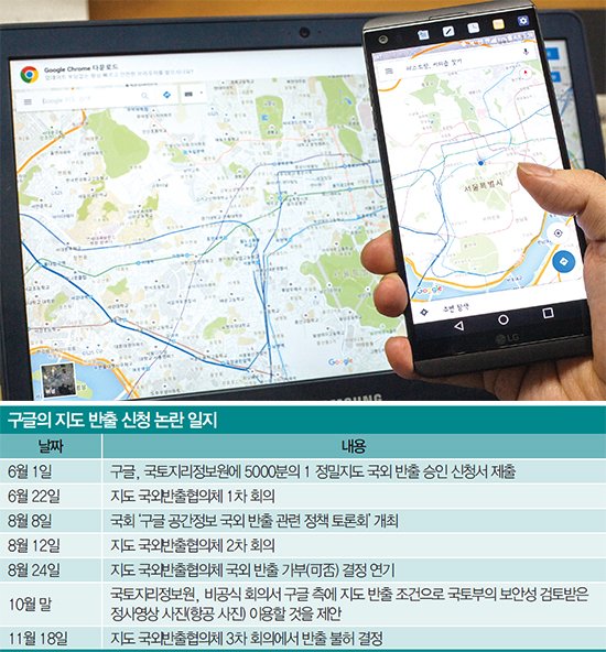 한국은 「공간정보의 구축 및 관리 등에 관한 법률」에 따라 일정 해상도 이상의 공간정보를 국외로 반출하려면 국가의 허가를 받아야 한다. 이 법률은 국가 안보, 특히 군사시설 보호를 이유로 고정밀 지도의 해외 유출을 제한하고 있으며, 구체적으로는 해상도 1:5000 이하의 지도, 또는 위치 정확도가 1미터 이내인 지도는 국외로 반출할 수 없도록 규정되어 있다. 이에 따라 구글, 애플 등 외국계 기업은 한국에서 제공하는 지도 서비스에서 정밀한 내비게이션 기능이나 스트리트 뷰 서비스를 제공하지 못하고 있다. 예컨대, 구글은 한국 내에서 자율주행차 서비스를 제공하려 해도 고정밀 지도 데이터를 확보할 수 없어 난항을 겪고 있다.