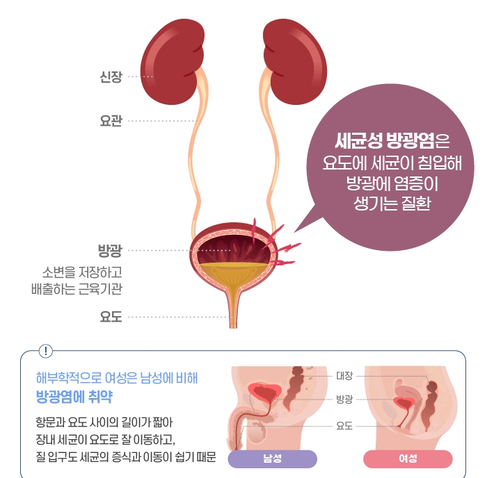 2. 요로감염증(UTI): 소변이 방광에 너무 오래 머무르면 세균이 증식할 위험이 높아진다. 특히 여성의 경우 요도가 짧아 감염 가능성이 높아지며, 요도염이나 방광염, 심하면 신우신염으로 이어질 수 있다.
