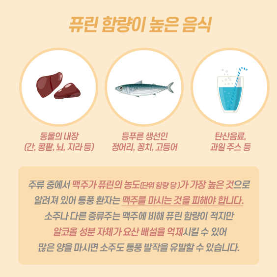 문제는 여기에 맥주가 더해질 때 발생한다. 맥주는 다른 주류보다 퓨린 함량이 특히 높으며, 이뇨작용을 일으켜 혈중 요산 수치를 더 쉽게 상승시킨다. 게다가 알코올 자체가 요산의 배출을 방해하기 때문에 치킨과 맥주는 퓨린 과잉과 요산 배출 저하라는 ‘이중 악영향’을 끼친다.