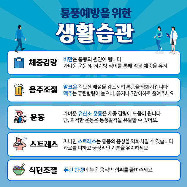 4. 규칙적인 운동: 과체중은 통풍의 중요한 위험 요인이므로 꾸준한 운동을 통해 체중을 조절해야 한다.