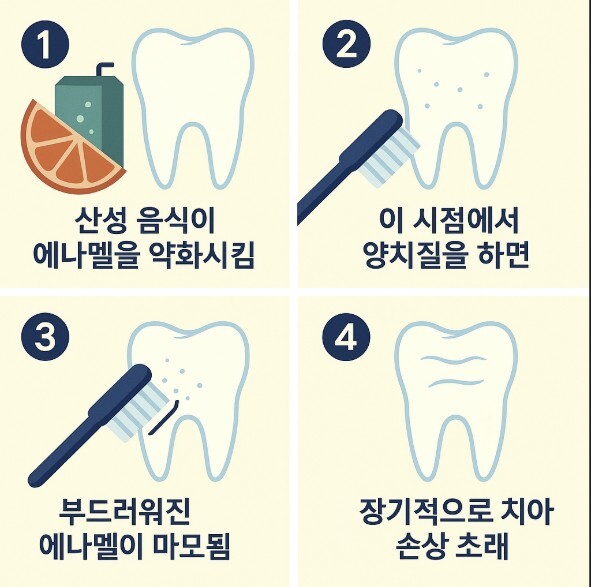 산성 식사 후 즉시 양치 시 오히려 해로울 수 있음
