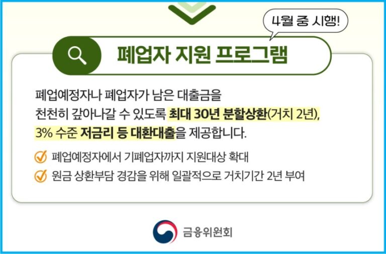 정부는 이러한 상황을 심각하게 받아들이고, 소상공인과 개인사업자들의 연착륙을 지원하기 위한 정책적 방안을 모색해왔다. 그 결과, 폐업 예정이거나 폐업한 소상공인 및 개인사업자를 대상으로 대출금을 최대 30년에 걸쳐 분할 상환할 수 있도록 지원하는 대책을 발표했다.