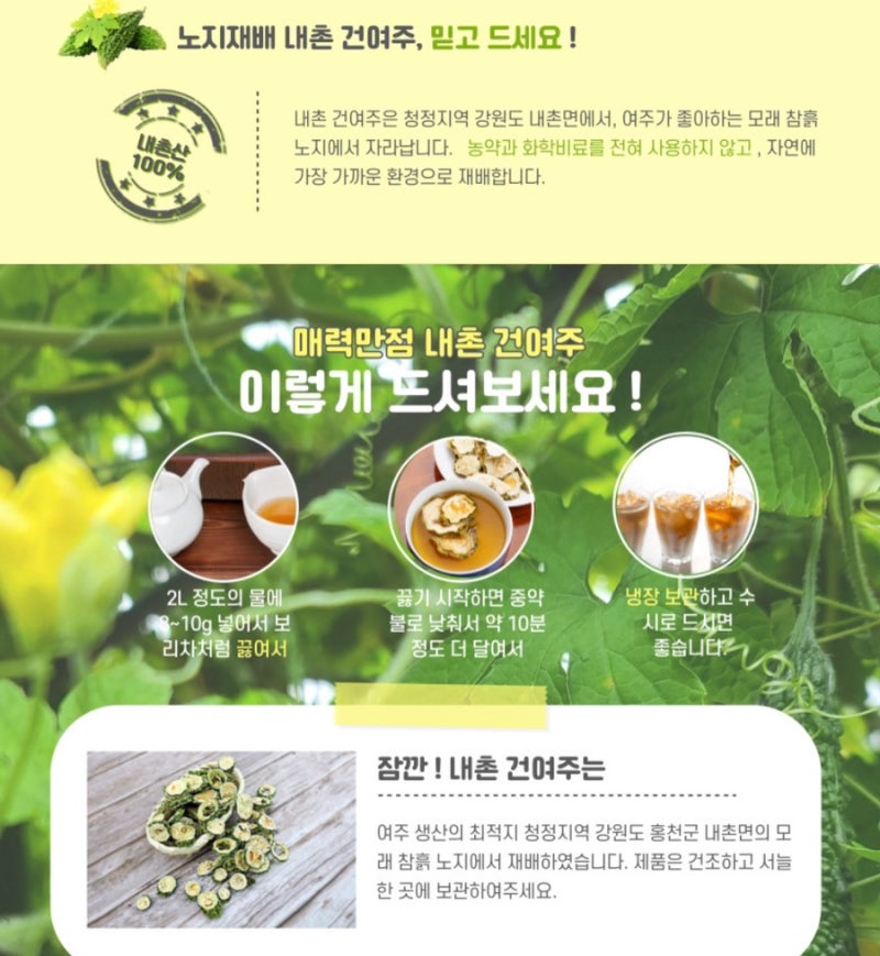 차로 우려 마시기: 건조한 여주를 차로 끓여 마시면 편하게 섭취 가능.