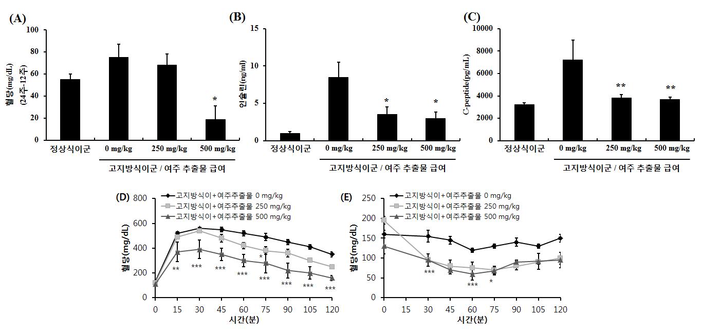 여주 주정추출물 섭취가 혈당(A), 인슐린(B), C-peptide(C) 양과 내당능(D), 인슐린 저항성(E)에 미치는 영향