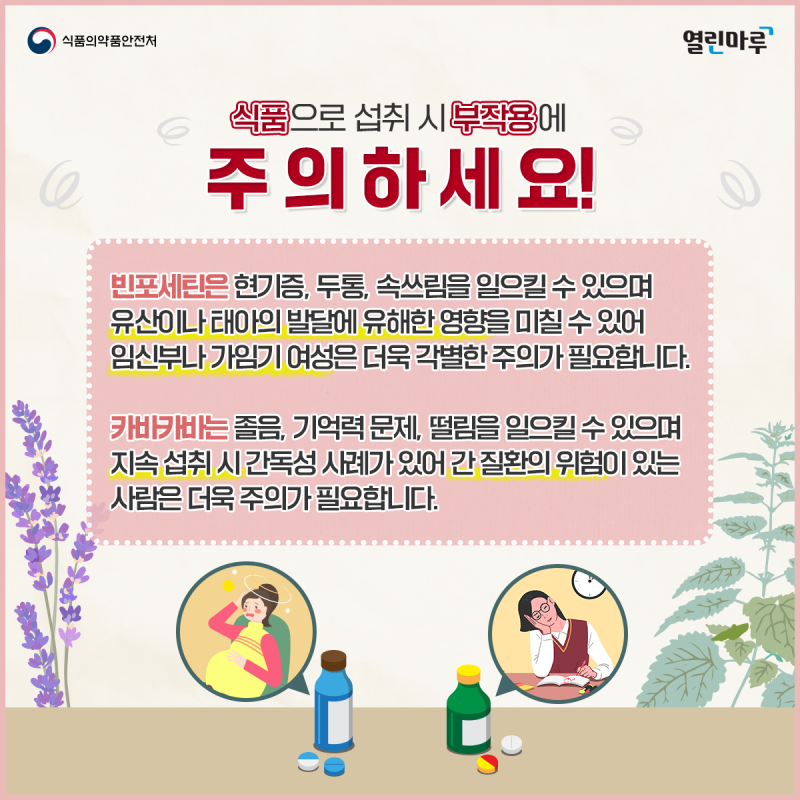 간 독성 위험: 카바의 주요 부작용은 간독성이다. 만성 염증은 간 기능에도 부담을 주는 상태이므로, 카바의 간독성은 기존 염증 상태를 악화시킬 수 있다.