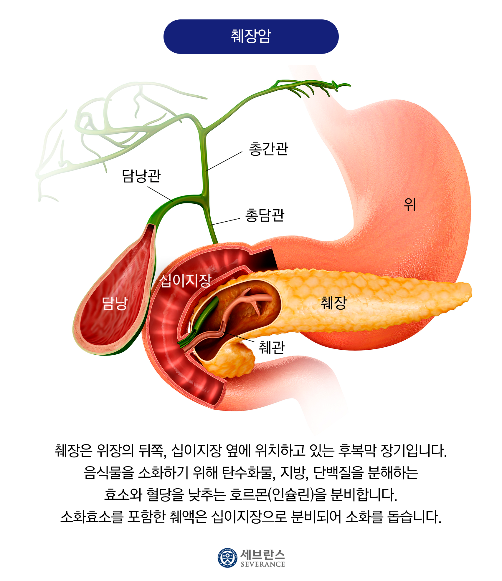 췌장암(pancreatic cancer)은 췌장에 발생하는 악성 종양으로, 대개 췌관세포(ductal cells)에서 발생하는 **췌장 선암(pancreatic ductal adenocarcinoma)**이 전체 췌장암의 약 90% 이상을 차지합니다. 췌장은 복부 깊숙이, 위 뒤쪽에 위치한 소화기관으로, 인슐린과 같은 호르몬을 분비하는 내분비 기능과 소화효소를 만드는 외분비 기능을 동시에 담당합니다.