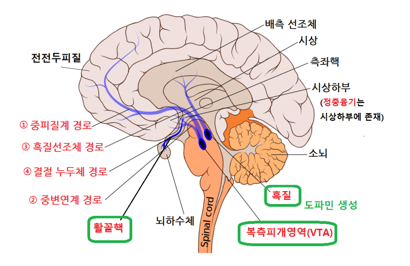 뇌에서 운동 제어를 담당하는 대표적인 구조 중 하나는 **흑질-선조체(dopaminergic nigrostriatal pathway)**라고 불리는 도파민 신경계입니다. 흑질(substantia nigra)은 뇌간의 일부분으로, 여기서 생성된 도파민이 **선조체(striatum)**로 전달되면서 운동의 시작과 조절을 매개합니다. 이 회로는 자발적 운동, 근긴장도 조절, 운동 동기부여에 필수적인 기능을 수행합니다.
