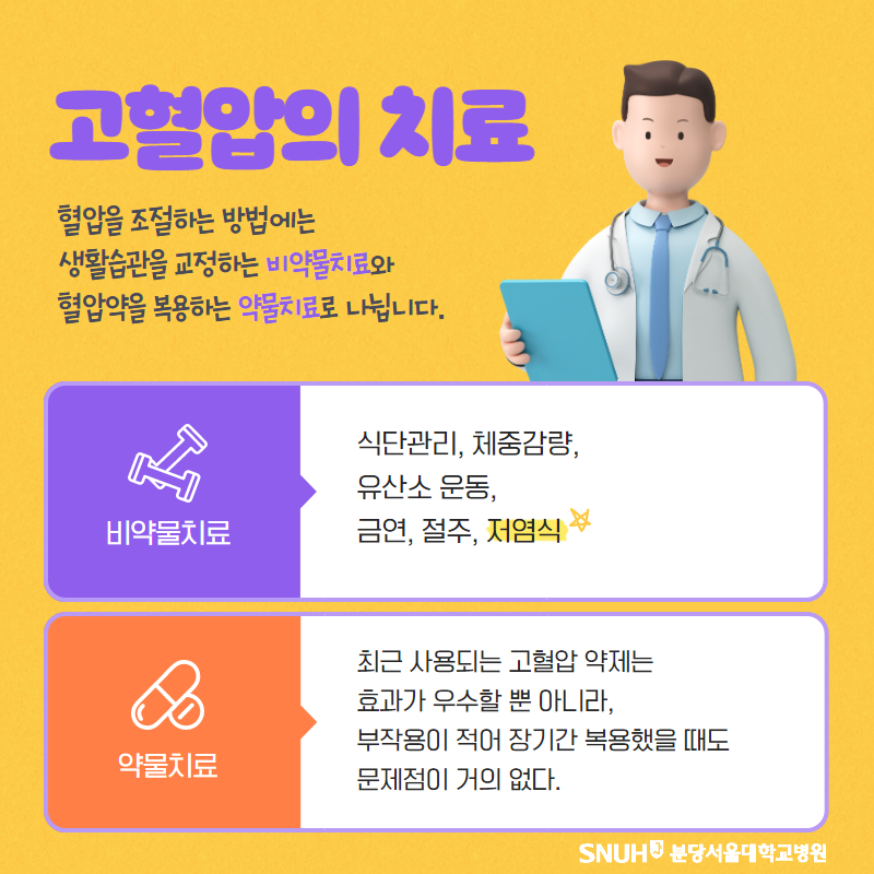생활습관 개선만으로 혈압 조절이 어려운 경우에는 약물치료가 필요하다. 고혈압 치료 약물은 혈관을 이완시키거나 체내 수분 배출을 촉진하거나 심장의 부담을 덜어주는 등 다양한 기전을 갖는다. 대표적으로는 이뇨제, 칼슘채널차단제, ACE 억제제, ARB 등이 사용된다.