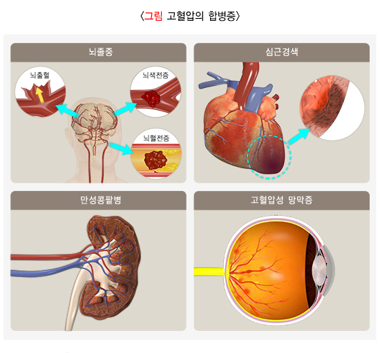 심장질환: 고혈압은 심장근육에 부담을 줘 좌심실 비대, 협심증, 심부전 등으로 발전할 수 있다. 이는 결국 심장의 펌프 기능 저하로 이어진다.