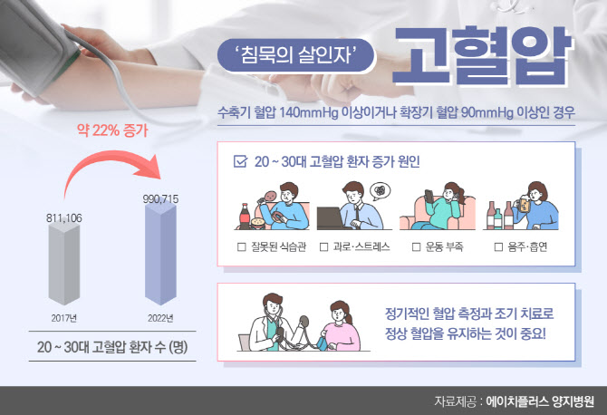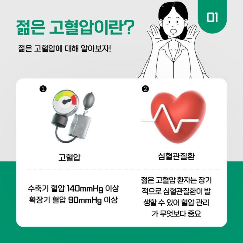 젊은 고혈압은 특히 문제인 이유가 있다. 조기에 발병할수록 혈관 손상이 누적되는 시간이 길어지고, 뇌졸중이나 심근경색 등의 중대 합병증이 더 빠르게 나타날 수 있기 때문이다. 또한 본인이 고혈압이라는 자각이 낮아, 치료나 관리가 뒤늦게 이뤄지는 경우가 많다.