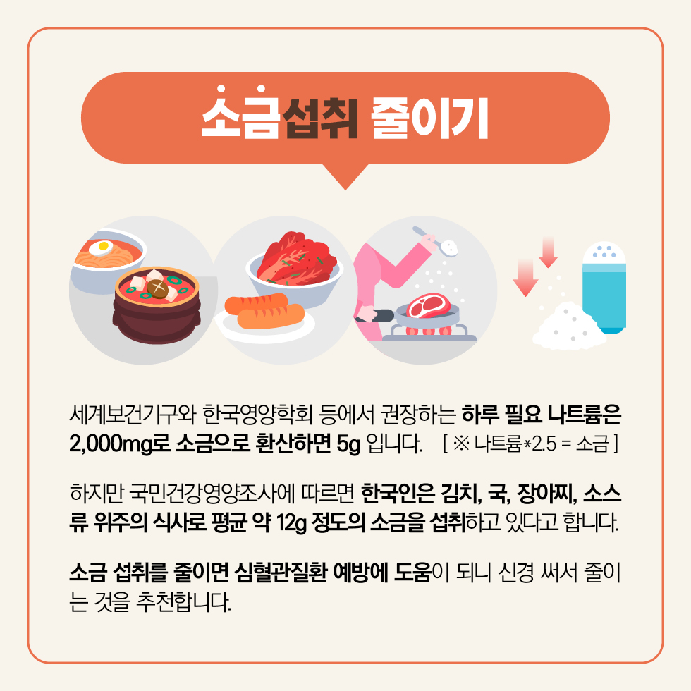 소금 섭취 줄이기: 하루 나트륨 섭취량을 2,000mg 이하로 유지하는 것이 이상적이다.