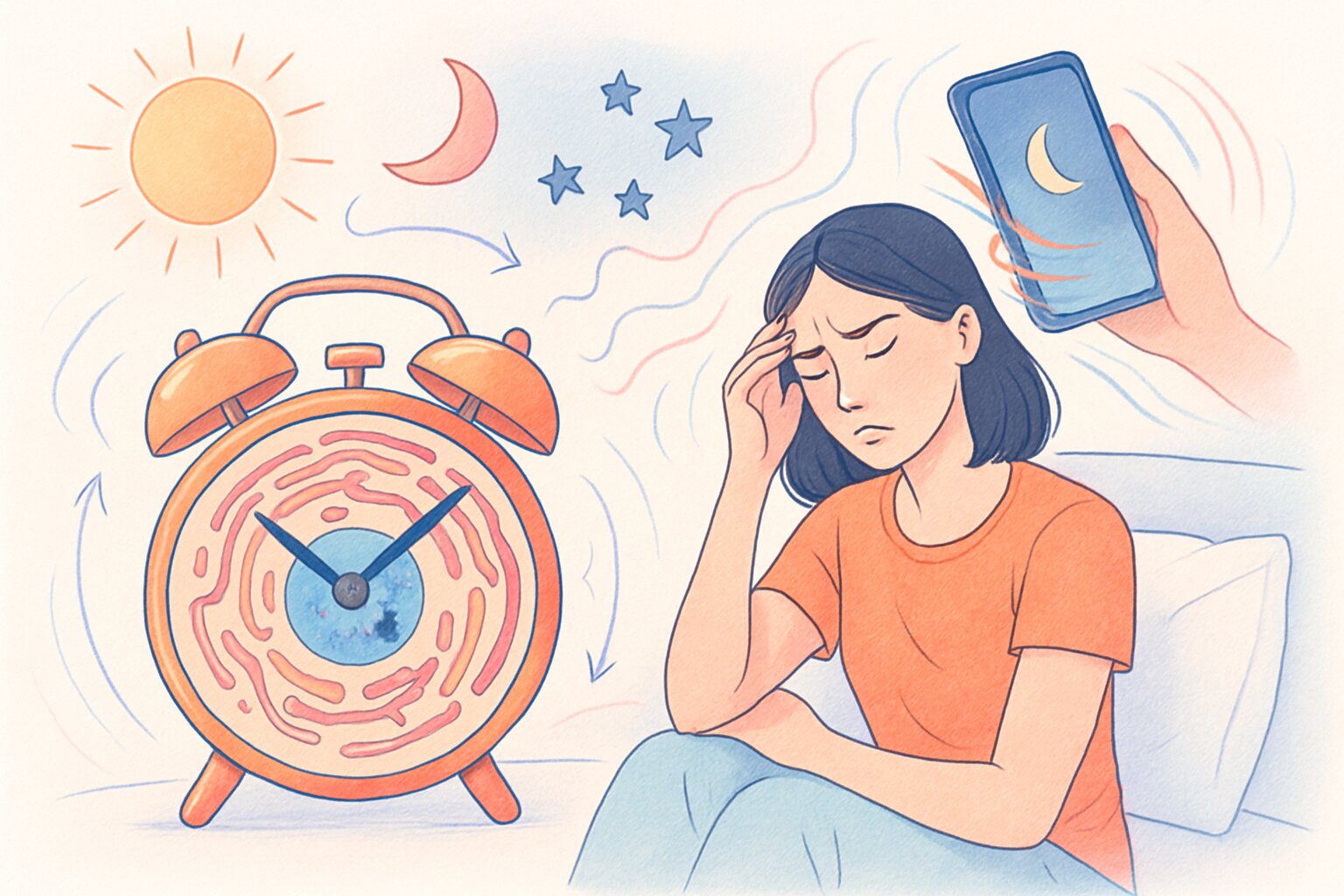 뇌의 **시교차상핵(SCN)**은 빛 자극에 따라 수면 호르몬인 멜라토닌을 조절하는데, 스마트폰 과다 사용이나 불규칙한 생활은 이 리듬을 교란합니다.