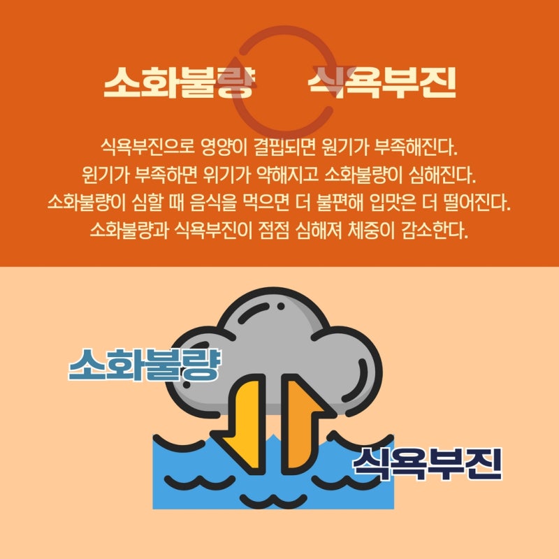 이 상태에서는 입맛이 떨어지고, 음식 섭취가 힘들어집니다.
