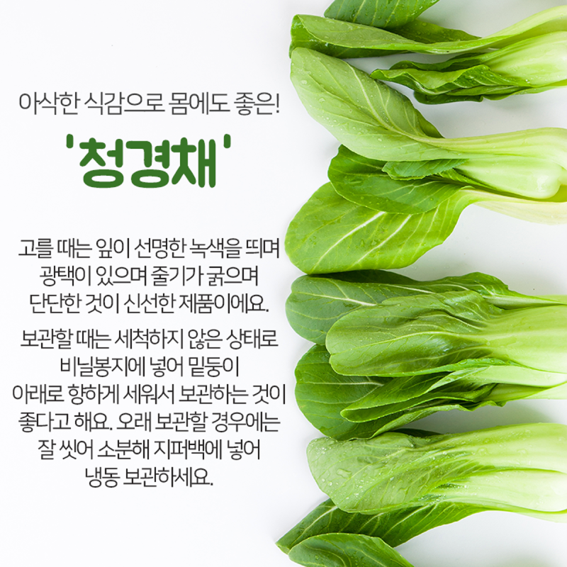청경채에는 비타민C, 베타카로틴, 엽산 등 면역력 강화에 도움을 주는 영양소가 풍부하게 함유되어 있다.