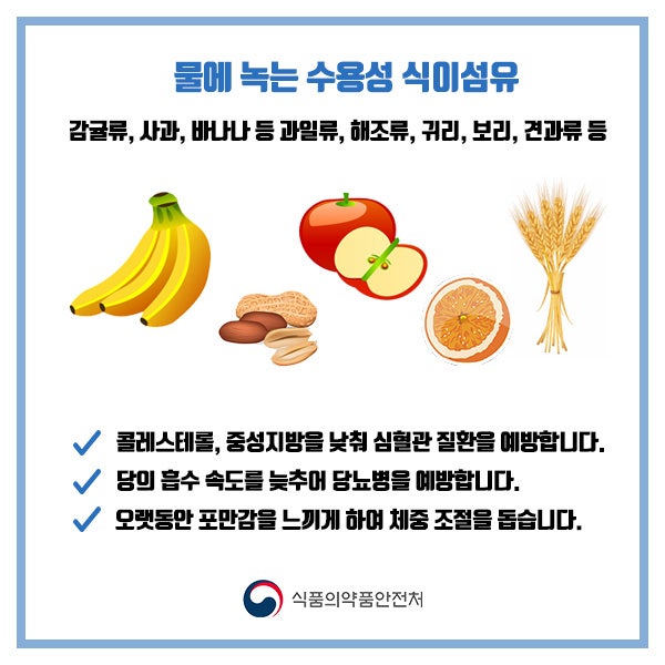 대표 식품: 귀리, 보리, 사과, 감귤류, 치아씨드, 콩류, 차전자피(psyllium husk)