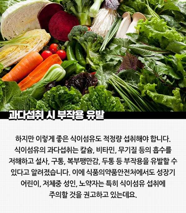 과도한 섬유질 섭취는 복부 팽만, 가스, 복통을 유발할 수 있으므로 점진적으로 양을 늘려야 한다.
