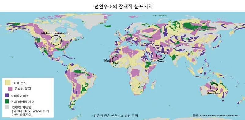 천연수소는 기존 화석연료처럼 특정 지역에 국한되지 않고 모든 대륙에서 발견 가능성이 있다는 것이 가장 큰 특징 중 하나다. 최근 탐사 사례를 보면 아프리카의 말리(Mali), 유럽의 프랑스 로렌 지역, 오스트레일리아, 미국의 미드웨스트 지역 등 매우 다양한 곳에서 천연수소 분출 및 축적이 확인되었다.