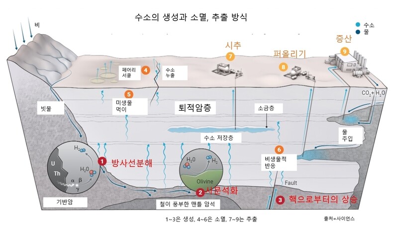 천연수소는 크게 지질학적 수화반응과 방사성 분해라는 두 가지 주요 메커니즘을 통해 생성된다.
