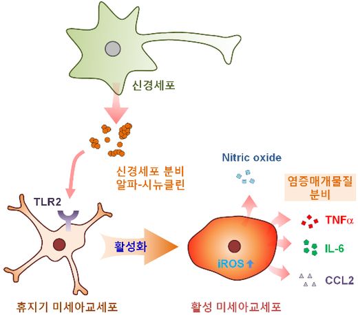 이러한 과정은 파킨슨병의 주요 병리인 *신경 염증(neuroinflammation)*을 일으키며, 뇌의 면역세포인 미세아교세포(microglia)의 활성화 및 산화 스트레스를 유발한다. 결과적으로 도파민을 분비하는 뉴런이 사멸하게 된다.