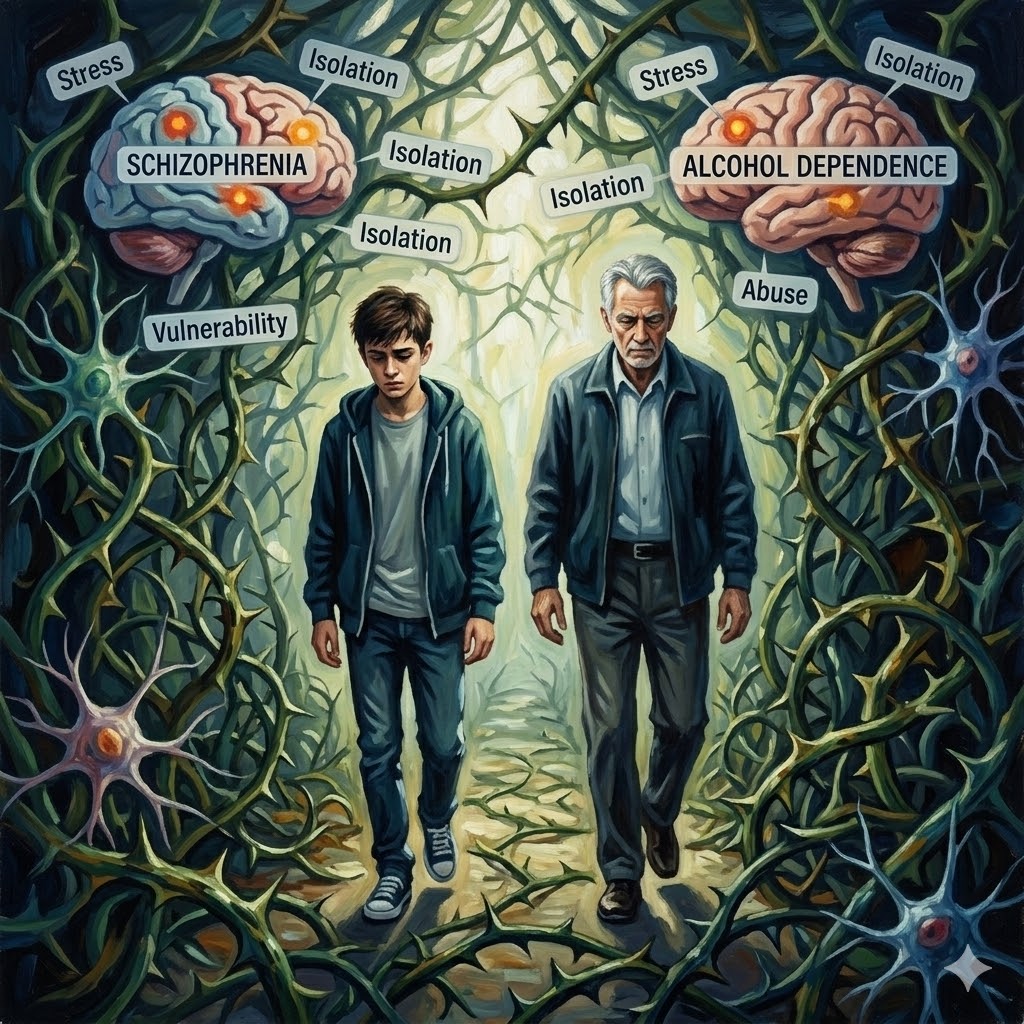 유전적으로 조현병에 취약한 사람이 청소년기에 스트레스, 학대, 사회적 고립 등의 환경 요인을 경험하면, 뇌 발달이 비정상적으로 이루어져 알코올 남용과 정신질환이 동시에 발생할 수 있다. 이는 유전자-환경 상호작용(gene-environment interaction)의 전형적인 사례다.