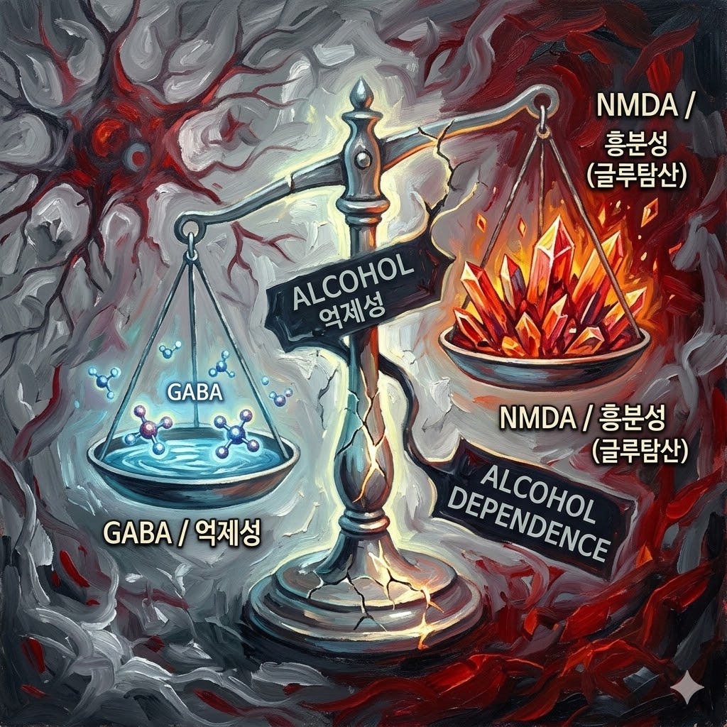 조현병과 알코올 의존은 모두 뇌의 억제성 신경전달물질인 GABA와 흥분성 전달물질인 글루탐산(특히 NMDA 수용체)의 불균형과 연관이 있다. 알코올은 GABA 수용체를 강화하고 NMDA 수용체를 억제함으로써 일시적인 진정 효과를 유도하지만, 장기적인 사용은 NMDA 과활성으로 인한 신경 독성(neurotoxicity)을 초래한다.
