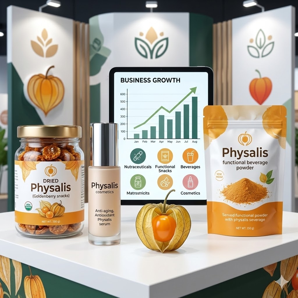 피살리스는 생과일뿐 아니라, 건조, 착즙, 추출 등의 다양한 형태로 가공이 가능하여 건강기능식품, 스낵, 음료, 잼 등으로의 활용도가 높다. 특히 ‘천연 항산화 기능성 식품’ 또는 ‘내추럴 프리바이오틱’이라는 콘셉트로 기능성 식품 시장에서 각광받고 있으며, 비타민 C와 플라보노이드 함량이 높은 원료로 화장품 산업에서도 피부 항산화와 미백 소재로 응용 가능성이 크다.