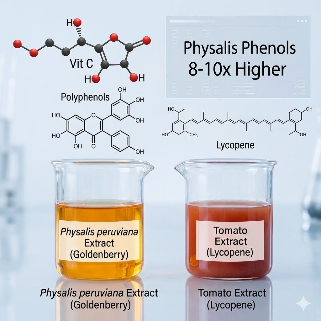 토마토가 항산화 성분으로 널리 알려진 것은 주로 리코펜(lycopene)의 높은 함량 때문이다. 리코펜은 강력한 카로티노이드로, 세포 손상, 노화, 암, 심혈관질환의 위험을 낮추는 데 도움을 준다. 반면 피살리스는 리코펜은 많이 함유하지 않지만, **페놀류(polyphenols)**와 플라보노이드(flavonoids), 특히 **쿠에르세틴(quercetin)**과 카페산(caffeic acid), 페룰산(ferulic acid) 등 생리활성 물질이 풍부하다. 또한 비타민 C의 함량이 토마토의 5~10배에 달하며, 비타민 A, E, 루테인도 상당량 포함되어 있어 종합적인 항산화 효과는 토마토를 상회할 수 있다는 연구 결과가 다수 존재한다.