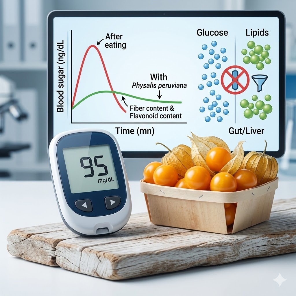 피살리스는 혈당 조절 및 지질 대사에도 긍정적인 영향을 미친다. 이는 주로 피살리스에 존재하는 식이섬유, 페놀계 화합물, 크롬 등의 미량무기질 덕분이다. 식이섬유는 장내에서 당의 흡수를 지연시켜 식후 혈당 급상승을 방지하고, 플라보노이드는 간에서의 글루코스 생산을 억제하며 인슐린 민감성을 높인다. 크롬은 인슐린 수용체의 반응성을 개선하는 데 도움을 준다.