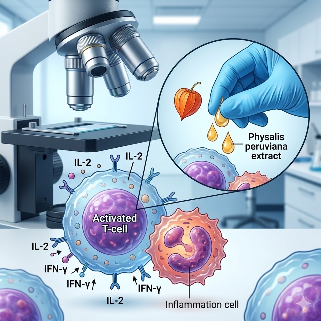 피살리스는 다당류(polysaccharides)와 비타민 C, 플라보노이드가 복합적으로 작용해 면역세포의 활성을 높이는 데 기여한다. 특히 인터루킨-2(IL-2) 및 **인터페론-γ(IFN-γ)**의 생성을 유도해 면역세포 간의 신호 전달과 림프구 활성화를 촉진한다. 또한 항염증 효과도 뛰어나, **사이클로옥시게나제-2(COX-2)**나 TNF-α와 같은 염증 매개 분자의 발현을 억제하는 것으로 보고된다.