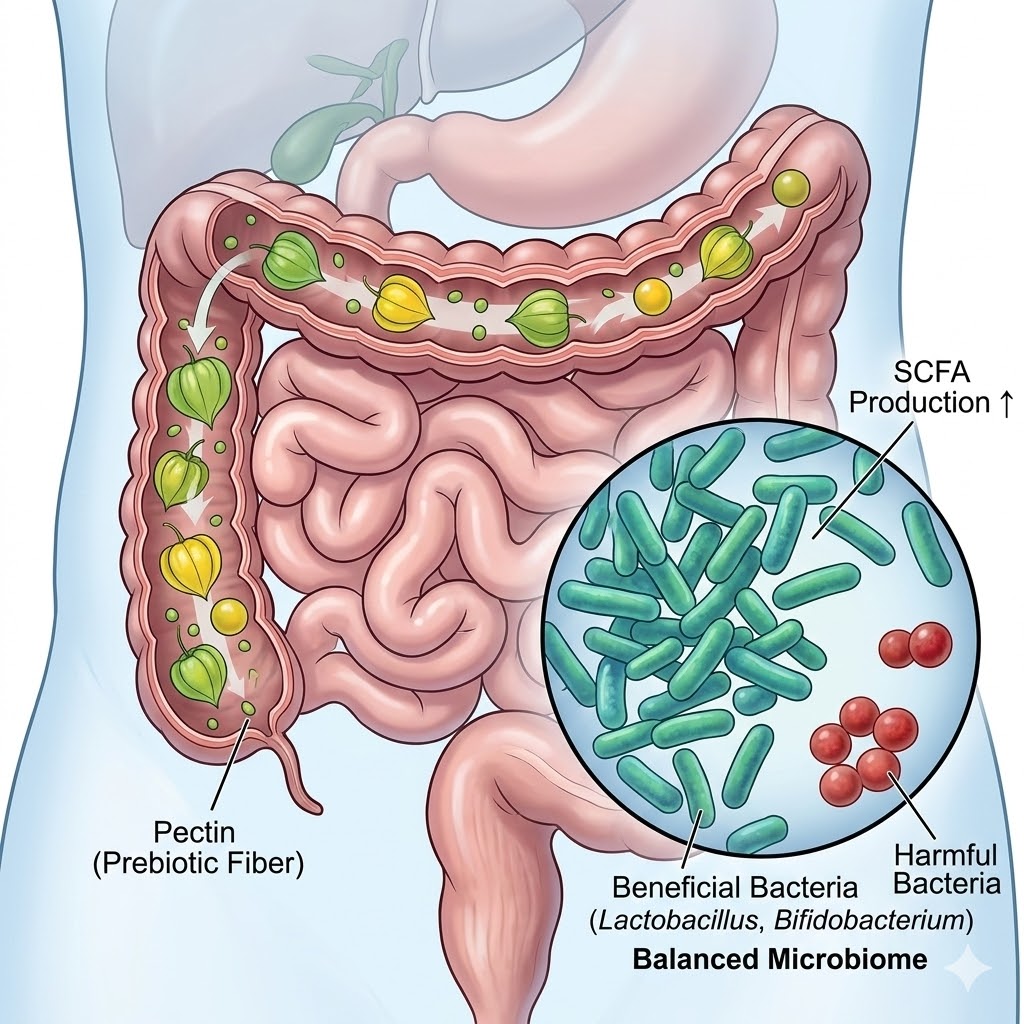 피살리스에 포함된 펙틴류 섬유소는 장내 유익균(특히 비피도박테리아와 락토바실러스)의 증식을 돕는 프리바이오틱스로 작용한다. 이를 통해 장내 미생물군 균형을 유지하며, 소화 기능 개선, 변비 예방, 면역 기능 강화에 이바지한다. 일부 연구에서는 피살리스 섭취 후 장내 단쇄지방산(SCFA) 수치가 증가하는 것으로 나타났으며, 이는 장 점막 건강과 항염 작용에 긍정적인 영향을 미친다.