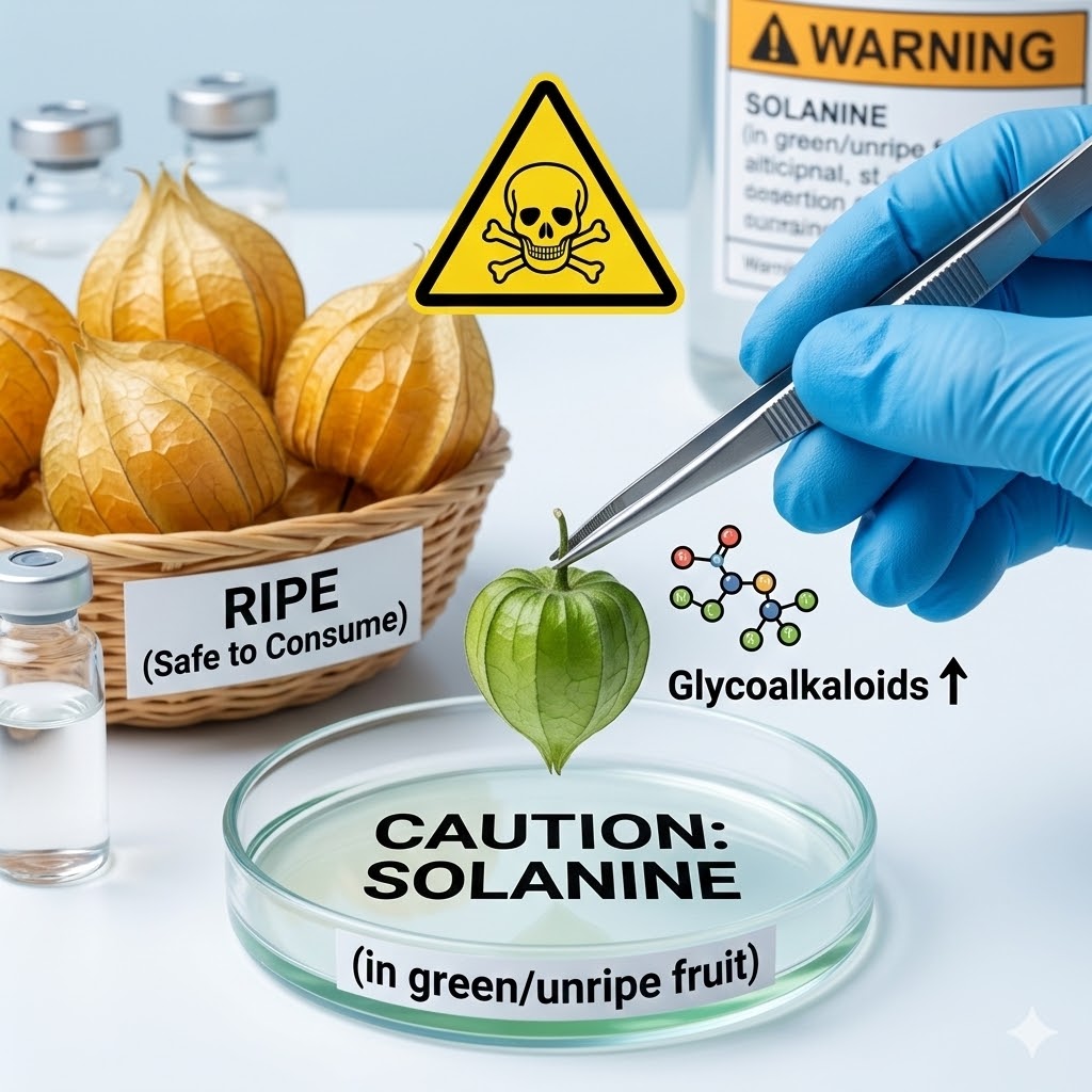 피살리스는 대부분 안전한 식품으로 간주되지만, 덜 익은 과일에는 **솔라닌(solamine)**과 같은 독성 글리코알칼로이드가 존재할 수 있다. 이는 감자나 가지류에서 발견되는 자연 독성 성분으로, 과량 섭취 시 메스꺼움, 구토, 복통 등을 유발할 수 있으므로 반드시 익은 상태에서 섭취해야 한다. 또한, 위티페롤리드와 같은 생리활성 물질은 고용량에서 호르몬에 영향을 줄 수 있기 때문에 임산부나 호르몬 민감 질환을 가진 사람은 주의가 필요하다.