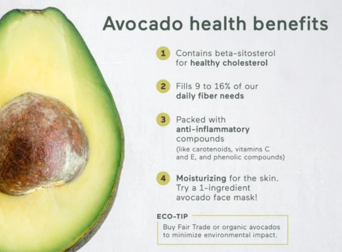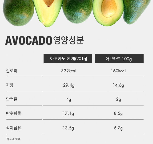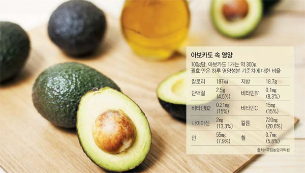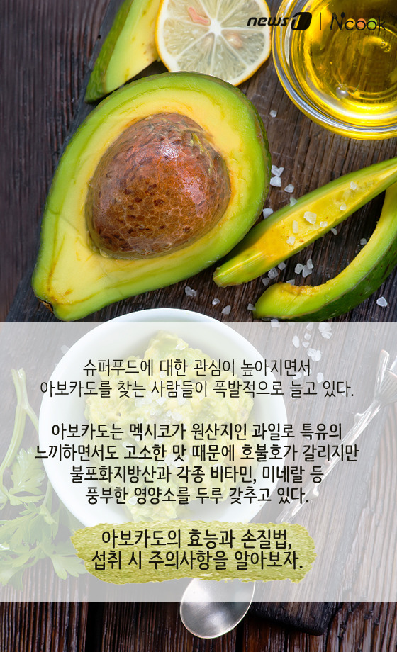 주의사항: 아보카도는 고지방 식품이므로 칼로리 과잉에 주의해야 하며, 과민성 장증후군 환자나 라텍스 알레르기 환자에겐 불편함을 유발할 수 있으므로 개인별 상태에 맞게 섭취해야 한다.