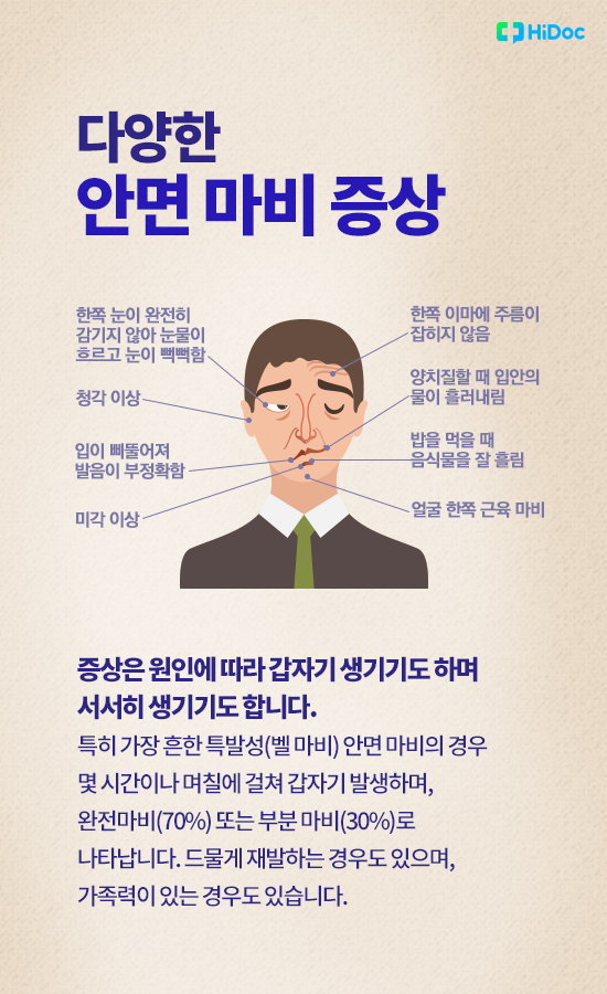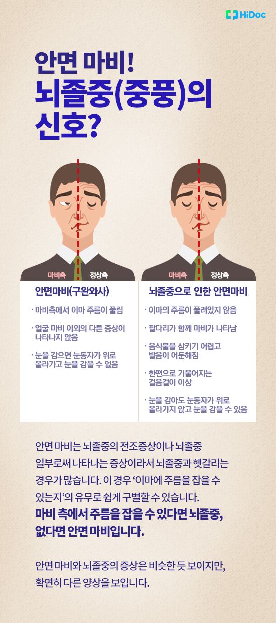 안면근육을 조절하는 운동 신경은 대뇌의 전두엽에 위치한 운동피질에서 기원합니다. 이 신경은 반대편 얼굴로 가기 때문에, 좌측 뇌에 문제가 생기면 우측 얼굴 근육에 마비가 오고, 우측 뇌에 이상이 생기면 좌측 얼굴에 증상이 나타납니다.