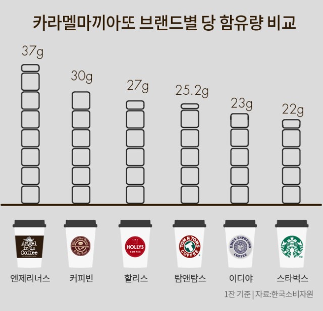 예를 들어, 일반적인 카라멜 마끼아또 한 잔에는 평균 설탕 30g 이상이 들어간다. 이는 세계보건기구(WHO)가 권장하는 하루 당 섭취량(25g)을 초과하는 수준이다. 설탕의 과잉 섭취는 인슐린 저항성, 지방간, 대사증후군, 심혈관질환 위험을 높이는 주요 요인이다. 즉, 커피에 들어간 설탕이 커피의 건강 효과를 모두 무력화시키는 셈이다.