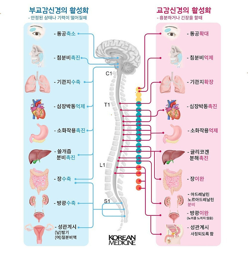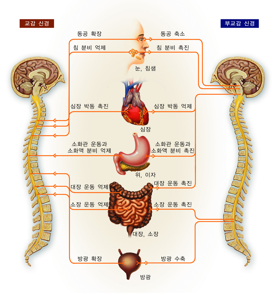 1. 교감신경(Sympathetic Nervous System): 위기 상황에서 몸을 ‘투쟁 또는 도피(fight or flight)’ 모드로 전환시켜 심박수와 혈압을 높이고, 혈당을 상승시켜 에너지를 준비시킨다.