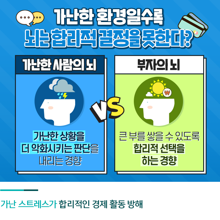 가난은 스트레스를 동반하며, 이는 뇌의 발달에 직접적 영향을 미칩니다. 스트레스 호르몬인 **코르티솔(Cortisol)**의 지속적인 분비는 해마(기억과 학습을 관장하는 뇌 부위)의 위축과 전전두엽(계획, 충동 조절, 판단력 조절 등 고차원적 사고를 담당)의 기능 저하를 유도합니다. 특히, 아동이 부모의 실직, 주거 불안정, 가정 내 갈등 등 만성적인 불안정 환경에 노출될 경우, 뇌 회로 자체가 ‘위협 기반’으로 발달하게 되며, 이는 인지 능력보다 생존과 회피 행동을 강화하는 방향으로 진화하게 됩니다.