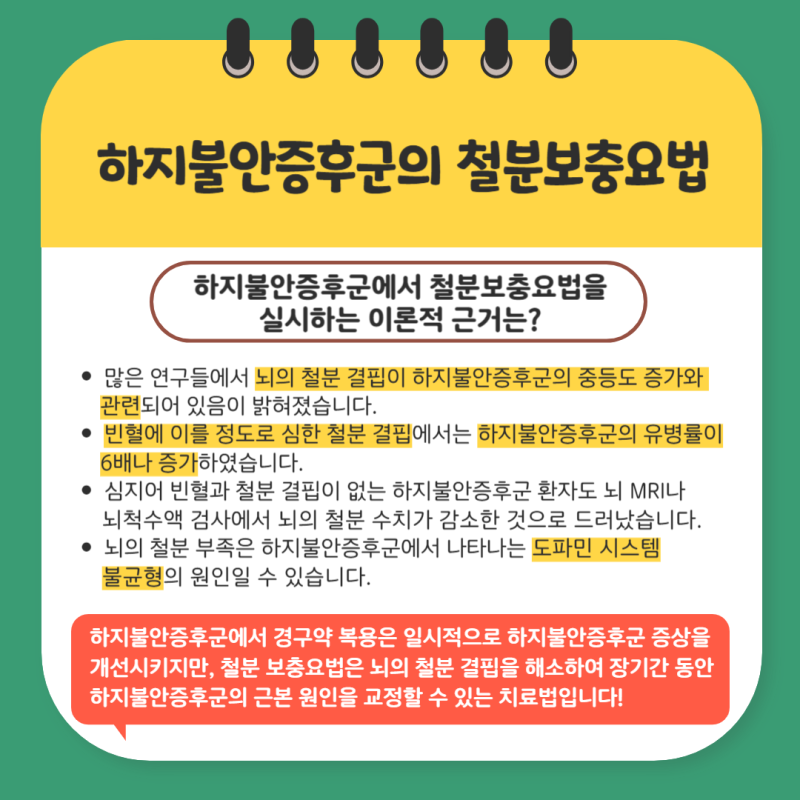 특히 **페리틴 수치(철분 저장 형태)**가 낮은 경우 증상이 뚜렷해지며, 혈액검사에서 정상이라도 뇌에서의 철분 부족이 문제일 수 있다.