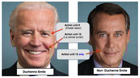 겉으로는 미소를 짓지만 눈빛에는 감정이 담기지 않는 사람은 흔히 "눈은 웃지 않는다"고 표현된다. 이는 비언어 심리학에서 감정 불일치(Incongruent Affect) 또는 미소-눈 분리 표현이라 부른다. 미소는 일반적으로 안면근육 중 **협근(zygomaticus major)**이 관여하지만, 진심어린 웃음에서는 **눈 주위의 안륜근(orbicularis oculi)**이 활성화된다. 후자를 '듀셴 미소(Duchenne smile)'라고 한다.