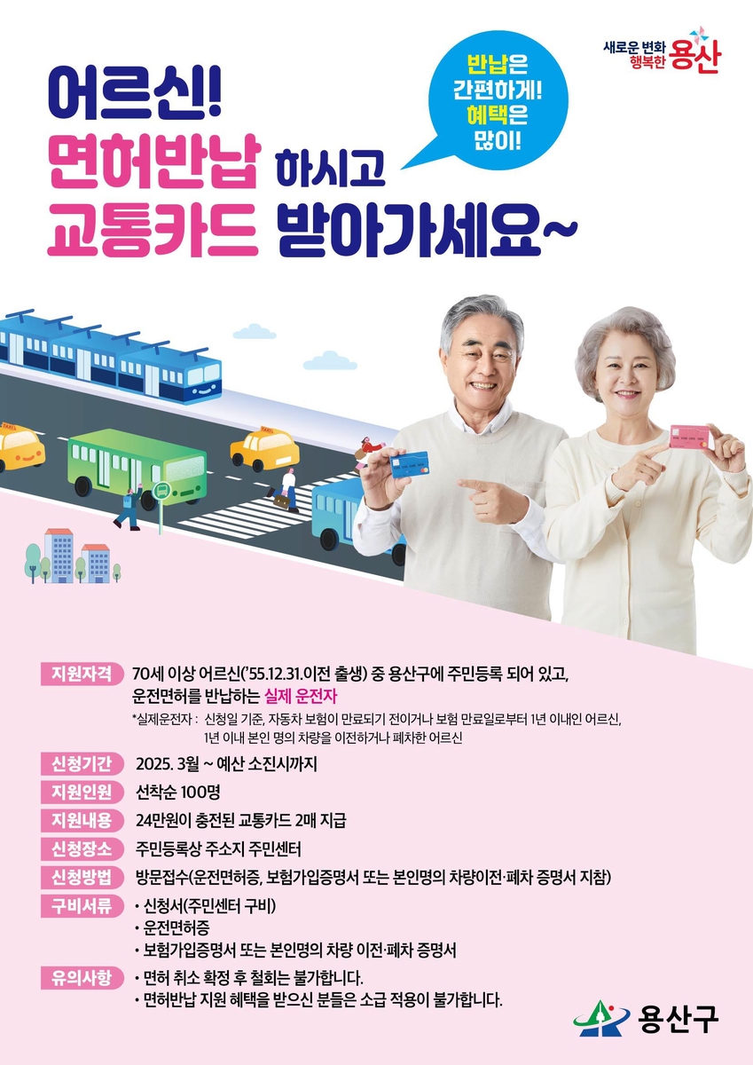 이번 지원 대상자는 용산구에 거주하는 만 70세 이상 고령 운전자다. 대상자는 운전면허를 자진 반납해야 하며, 면허 반납 후에는 운전을 할 수 없게 된다.