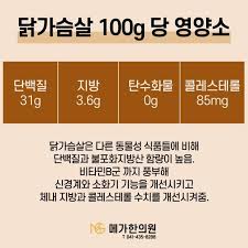 고단백 저지방: 닭가슴살은 지방 함량이 낮고 단백질 함량이 높아 다이어트와 근육 증가 모두에 적합합니다.