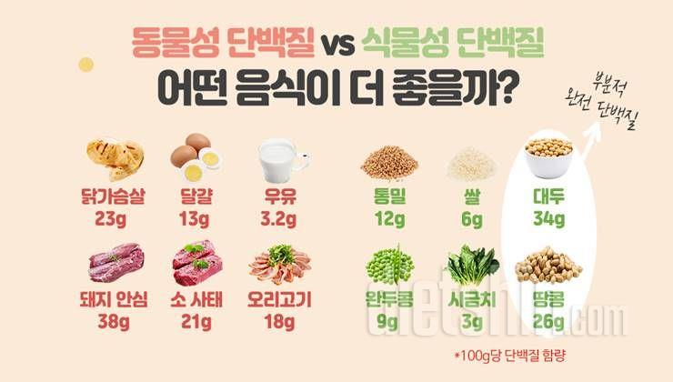 식물성과 동물성 단백질을 균형 있게 섭취하여, 아미노산 프로필을 다양하게 가져가는 것이 좋습니다.