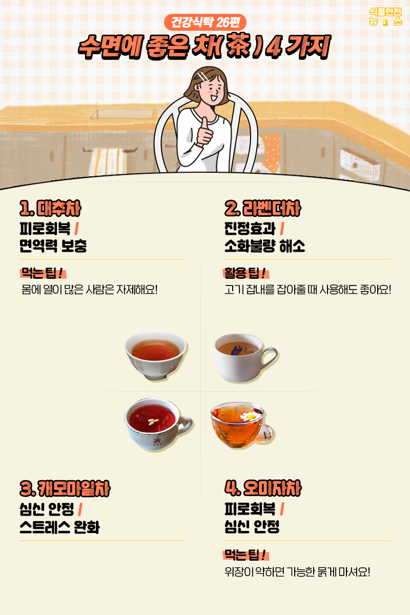 생강차나 대추차 등 몸을 따뜻하게 하는 차도 심신 안정에 좋습니다.