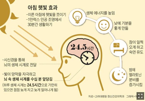 햇볕은 인간의 생체리듬, 즉 **서카디안 리듬(circadian rhythm)**을 조절하는 핵심 요소입니다. 아침 햇살을 쬐면 멜라토닌(수면을 유도하는 호르몬) 분비가 억제되고, 세로토닌(기분을 좋게 해주는 호르몬)이 활성화됩니다. 그렇게 하루를 활기차게 시작하면, 저녁에는 자연스럽게 멜라토닌 분비가 증가하며 졸음이 찾아오게 됩니다.